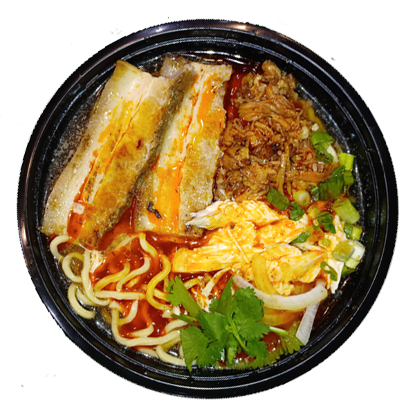 Brisket Birria, served over ramen, cheese, cilanto, and onions.